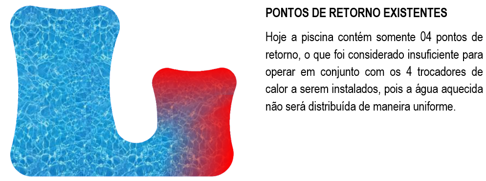 Após análise técnica, identificou-se também a necessidade de modificações nos pontos de retorno e criação de outros. O objetivo é que as piscinas sejam abastecidas com água aquecida enviada pelos trocadores de calor de forma uniforme, evitando assim a existência de pontos sem circulação de água, que podem permanecer com temperatura abaixo do esperado.