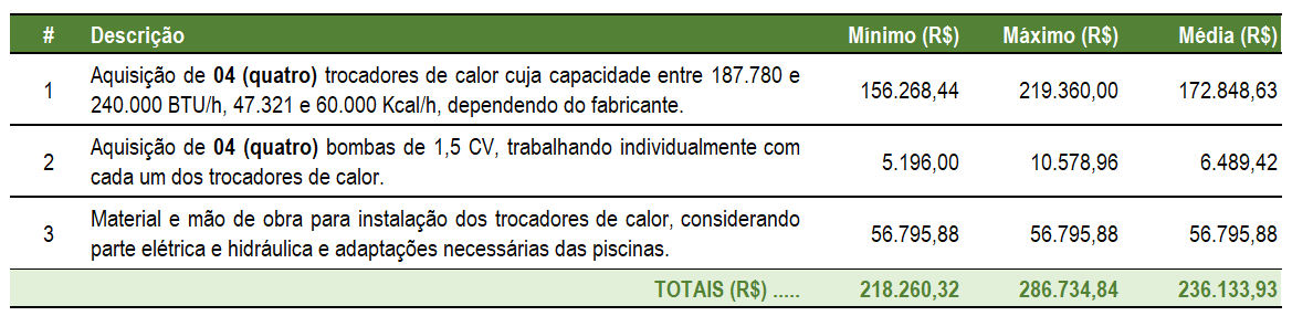 Foram escolhidas para aquecimento somente a piscina com raia olímpica (416 m³) e a social (109 m³) que são interligadas e se somados, totalizam 543 m³ de água a ser aquecida. Após consulta de empresas especializadas, verificou-se a necessidade de instalação de 04 (quatro) trocadores de calor, sugerindo-se os modelos Terma Max 9 da Nautilus ou Industek ID 200, com custo médio R$ 172.848,63 (agosto/2022).