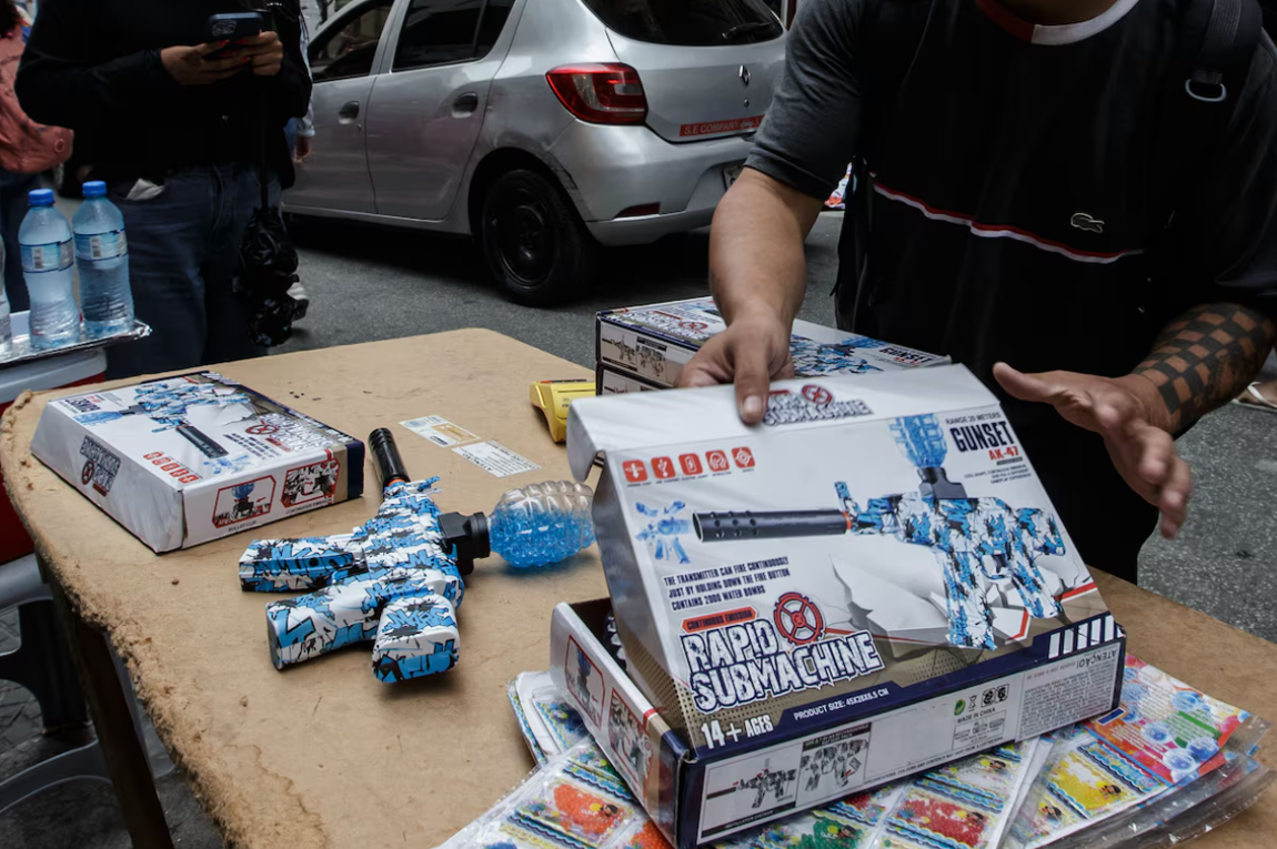 A definição correta é “arma de projéteis de gel” (em inglês, Gel Blaster) que correspondem a artefatos plásticos que imitam armas de fogo, com munição feitas de gel, que tornando-se uma febre no Brasil e no mundo.